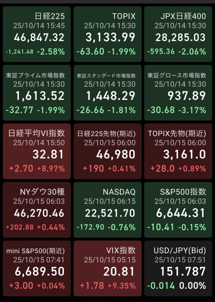 前日14日の日経平均は、政局不安と米中摩擦懸念が重なり、前営業日比−1,241円の46,847円(−2.58%)と急落。