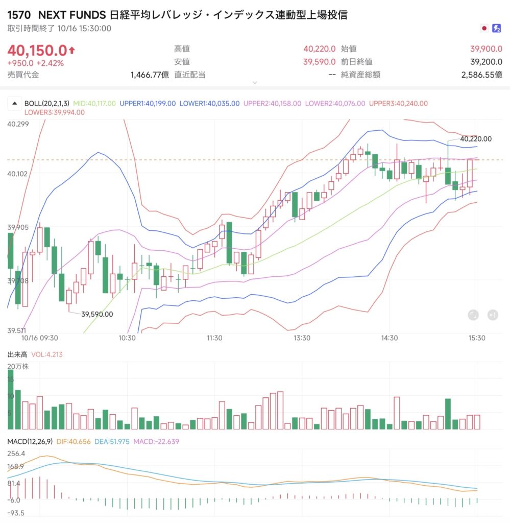 結果として、NF日経レバは始値39,900円、高値40,220円、安値39,590円、終値40,150円(+950/+2.42%)と、