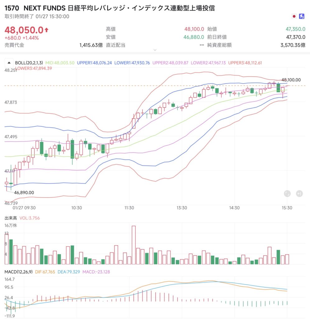 NF日経レバも日経平均の切り返しに素直に反応し、46,880円で底打ち後は上昇トレンドを形成。終値では48,000円台を回復し、前日の下落に対する自律反発としては十分な値動きとなった。