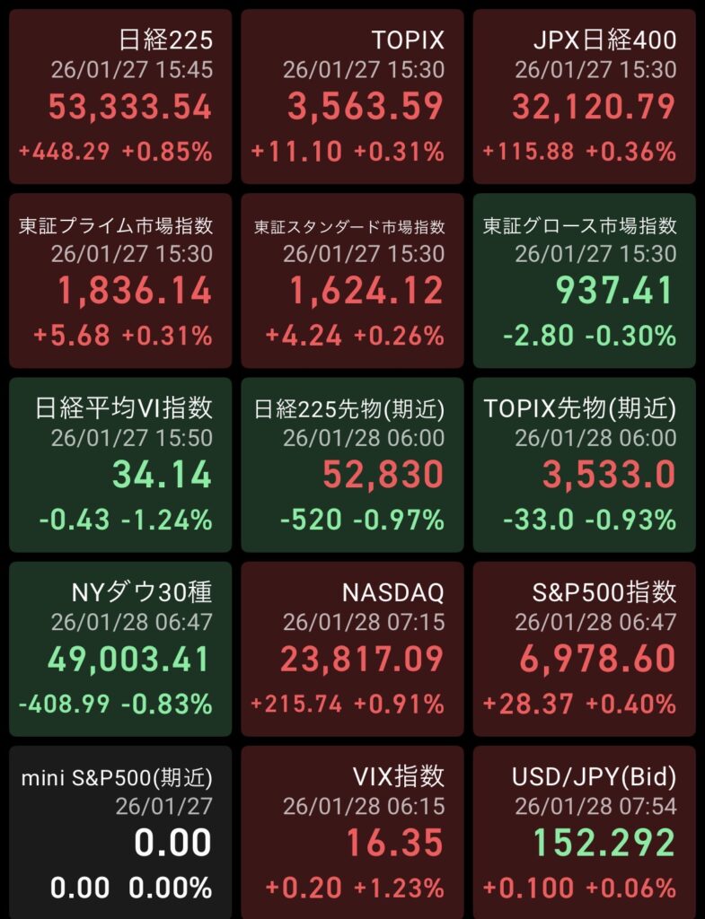 日経225は52,637円で下げ止まり、終値53,333円まで切り返し、NF日経レバ(1570)も46,880円を底に48,050円まで回復した。