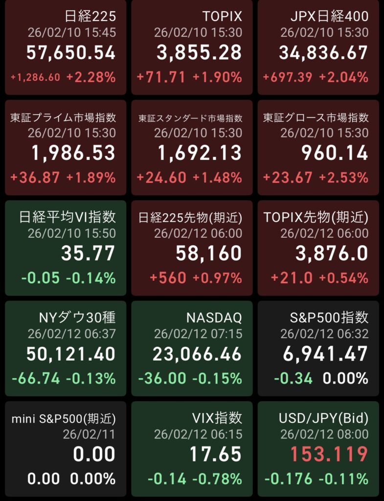日経平均は56,812円で始まり、そのまま押しを作らず57,650円で大引け。いわゆる寄り底型の上昇であり、典型的な資金流入相場である。