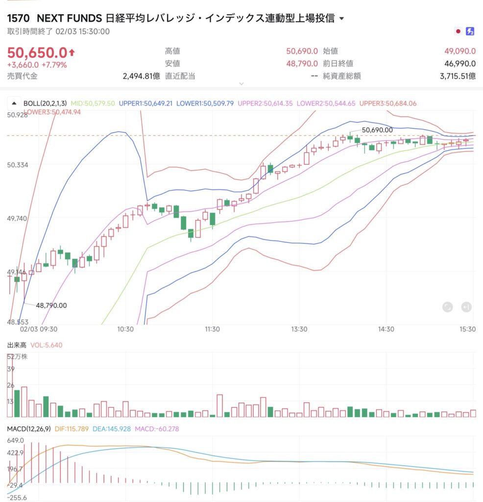- NF日経レバ(1570):始値 49,090 / 高値 50,690 / 安値 48,790 / 終値 50,650(前日比 +3,660)