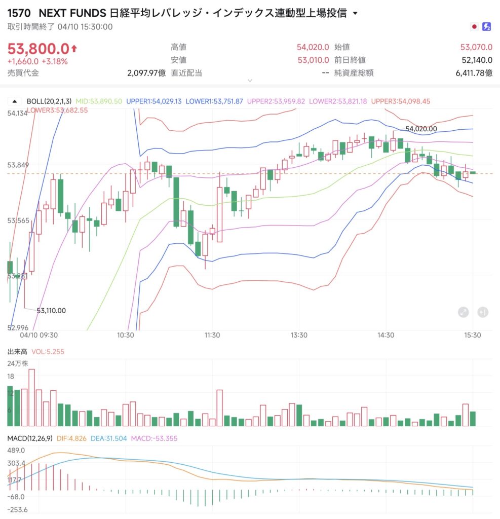 日経225は米国株高とファーストリテイリングの急騰に牽引され、寄り付きから300円超の上昇でスタート。その後も全く押し目を作ることなく上げ幅を拡大し、後場には一時57,000円の大台を回復する場面を見せた。NF日経レバも始値(53,070円)から一貫して上昇し、想定レンジの上限(53,800円)を突き抜けて54,020円まで上値を伸ばした。終値はピタリと想定レンジ上限の53,800円で引けており、買い方の勢いの強さを見せつける結果となった。