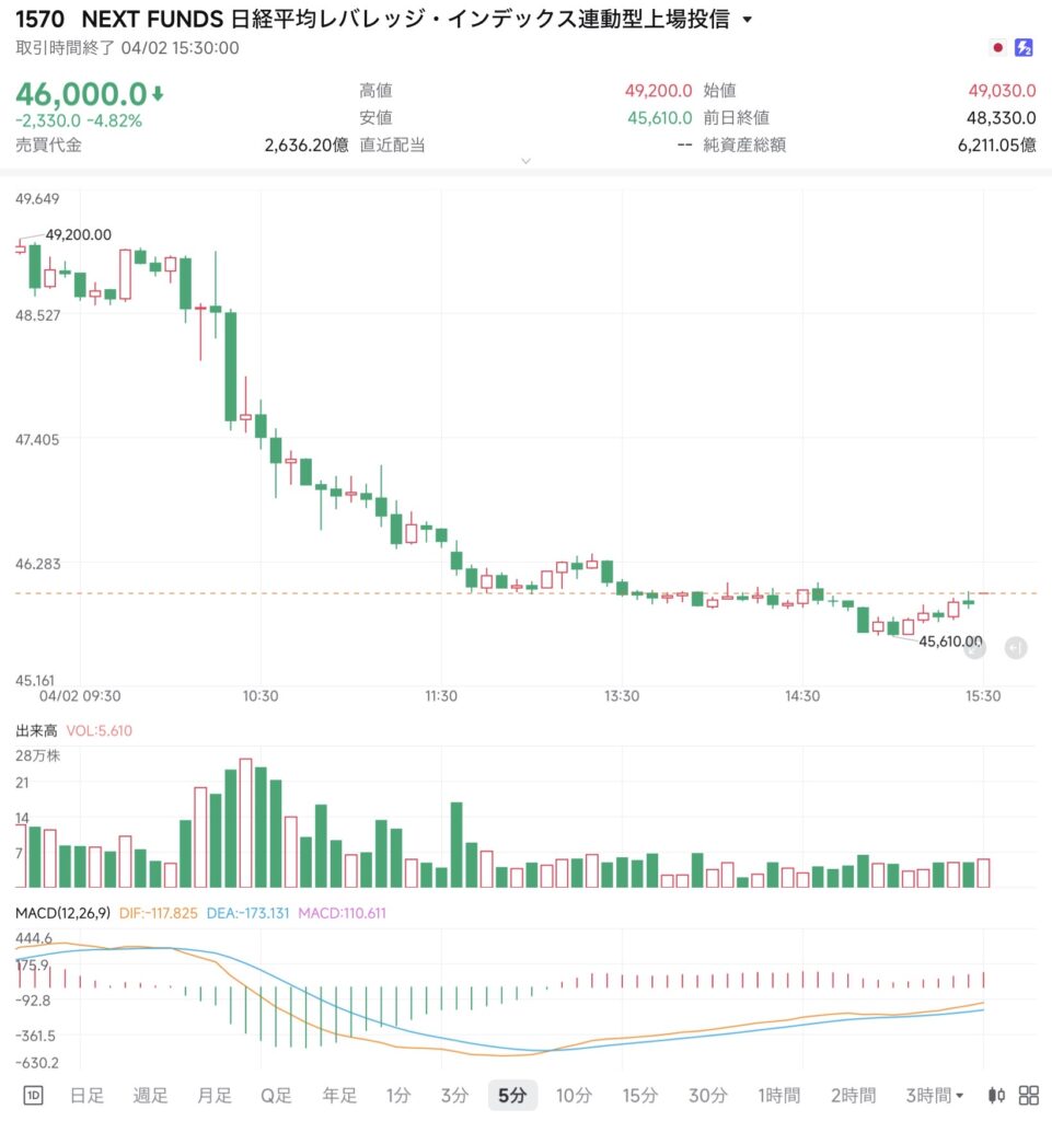 日経平均のロイター予測(下限53,000円)や、NF日経レバの自らの想定レンジ(下限47,000円)を大きく下掘る結果となり、地政学リスクの再燃が市場に与える破壊力を過小評価していた。トランプ大統領の発言という外部要因に相場全体がこれほどまでに振り回される脆弱な地合いにおいて、押し目買いの指値を入れることの危険性を改めて痛感した一日であった。
