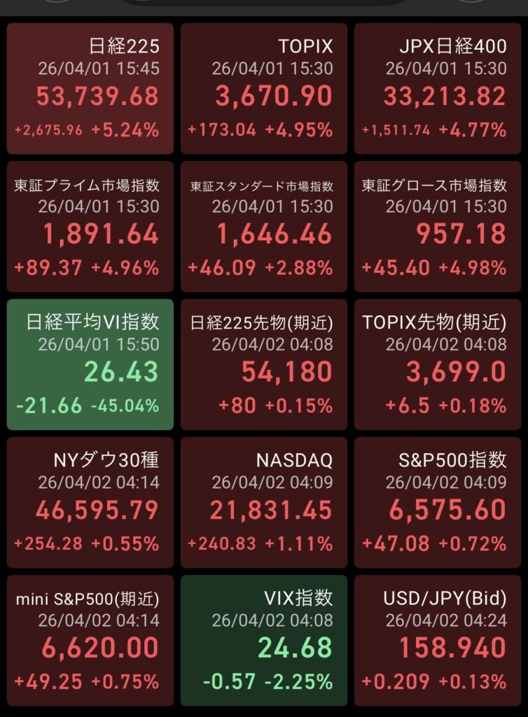 日経225は2,675円高の53,739円、NF日経レバ(1570)は4,440円高の48,330円と、ショート勢を完全に焼き尽くす圧倒的な強さを見せつけた。MACDや移動平均線などのテクニカル指標も強い上昇モメンタムを示し、まさに売り手不在の一本調子な展開であった。