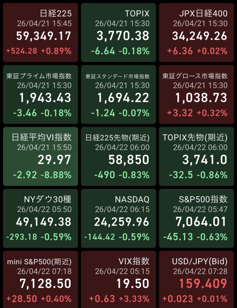前営業日である4月21日の相場は、日経225が終値59,349円(前日比+524円)と大幅続伸を見せた。NF日経レバ(1570)も同様に、終値58,390円(前日比+1,020円)と力強い上昇を記録している。