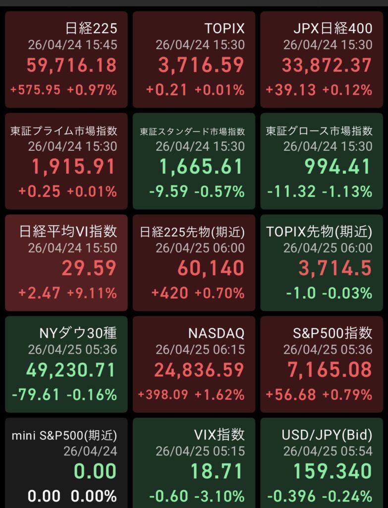 前営業日である4月24日の相場は、前日の狂乱相場(値幅3,100円)の余熱と米国市場でのハイテク株下落を背景に、事前の戦略では「ギャップダウンからの弱含み」を想定していた。しかし実際の値動きは、その想定を完全に覆し、米国株安を跳ね返して上昇。日経平均が再び「史上最高値を更新」する驚異的な強さを見せた。