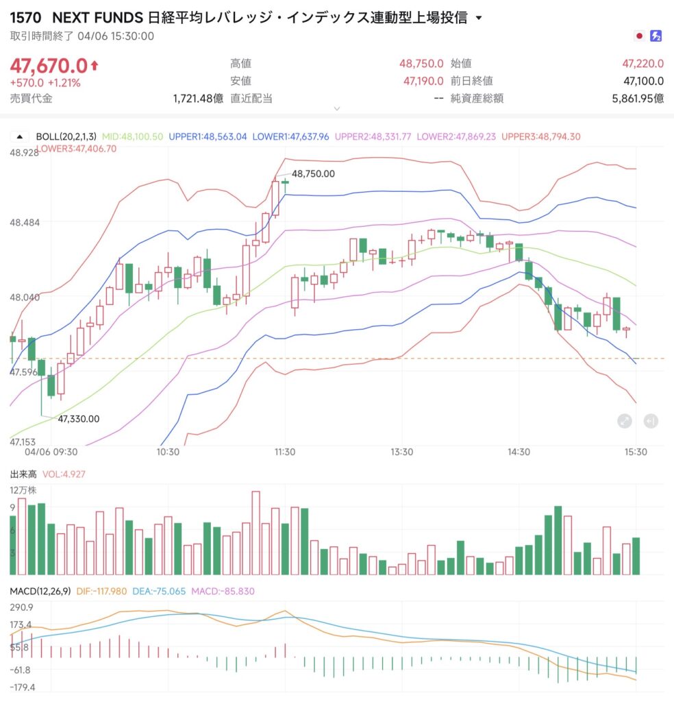 NF日経レバ(1570)のコアレンジを「46,800円〜48,500円」とやや広めに再設定する。MACDが底を這っている間はトレンドの発生を期待せず、レンジの上限・下限付近での短期的な逆張りを基本としつつ、前日同様の突発的なニュースによるレンジブレイクには即座に損切りで対応する、柔軟かつシビアな立ち回りが求められる。