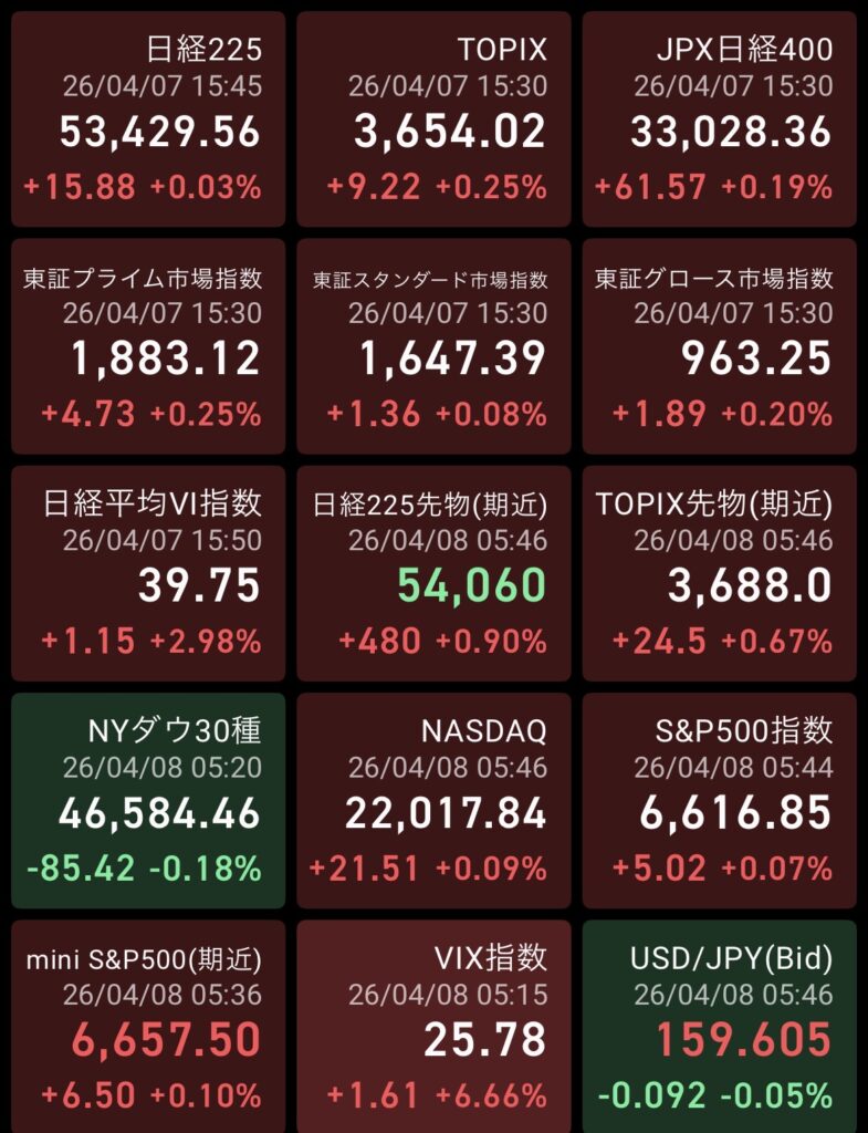 この一報を受け、足元で高止まりしていた米WTI原油先物は1バレル=99ドル台まで急落。インフレ懸念と企業業績への悪影響という重石が一旦取り払われたことで、日経225先物(期近)は54,060円(+480円)と大幅な上昇を見せている。