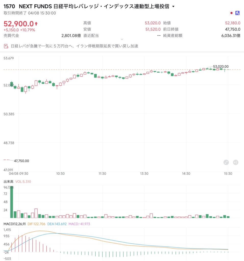日経225、NF日経レバともに、寄り付きから信じがたいほどの巨大な窓を開けてスタート。日経平均は54,000円をあっさりと超え、勢いそのままに55,000円、さらには56,000円の大台まで一気に駆け上がった。1570に至っては、事前の想定レンジ上限(49,500円)を寄り付き(52,180円)の時点で完全に置き去りにし、終値で前日比+5,150円という驚異的な上昇を記録。押し目らしい押し目を全く作らず、終日強い価格帯を維持し続ける「買いが買いを呼ぶ」展開であった。
