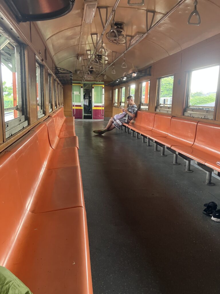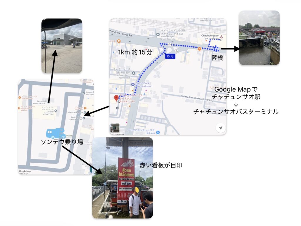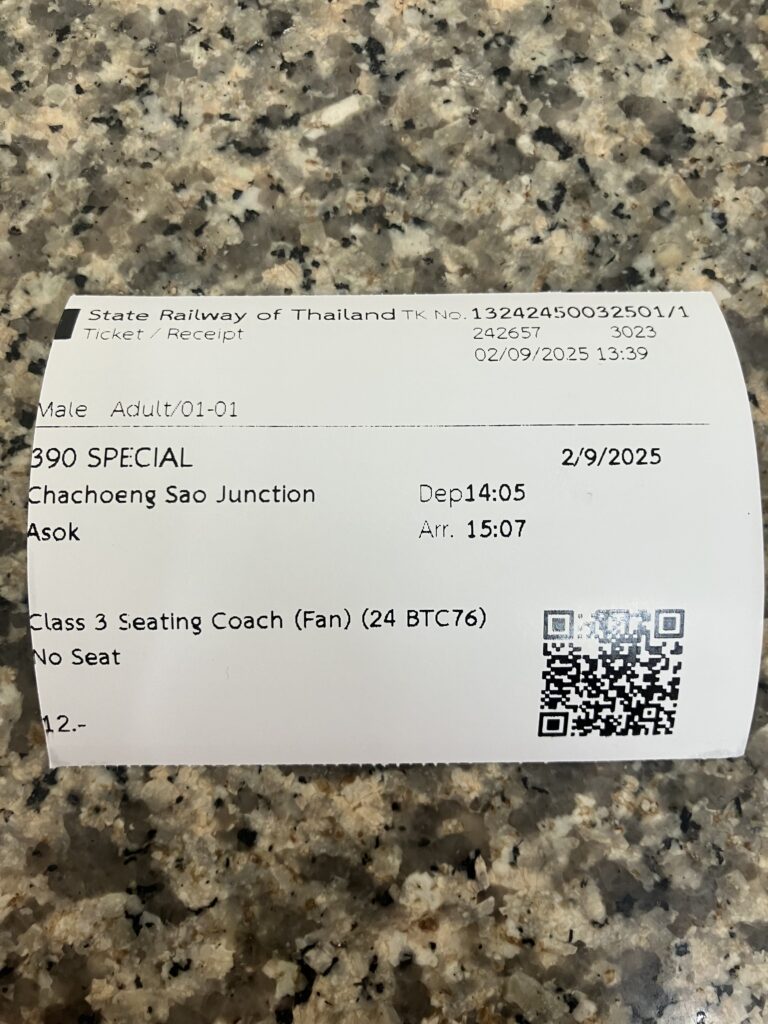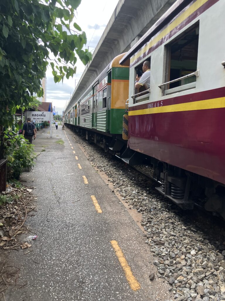一方で、タイ国鉄ルートは、予約渋滞なしで、バンコク市内からチャチュンサオ駅までが約1時間半、そこからソンテウで約30~40分を要し、合計の所要時間は約2時間半前後(待ち時間除く)が目安です。しかも列車内は座り心地悪いものの乗客閑散でゆったりしております。