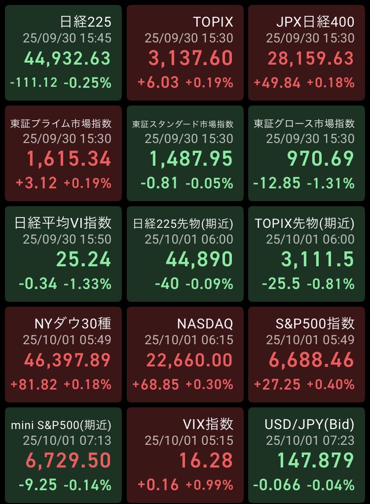 9月30日の日経225は111円安の44,932円と3日続落。寄り付きは米株高を受けて堅調に始まったものの、円高進行とイベント前の警戒感が重石となり、前場中盤には一時300円超の下落を記録した。後場は下値を切り返したが、戻りは限定的で終盤に再び売られる展開となった。