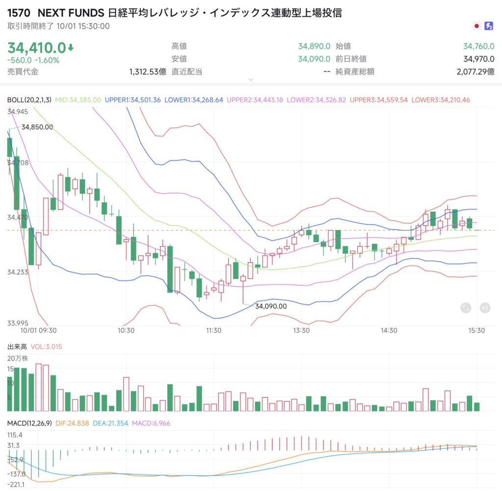 寄り前の予測では、日経平均は44,600〜45,200円のレンジを想定し、NF日経レバ(1570)のレンジを34,600〜35,200円と見立てた。戻り売り優先としつつも、34,700円割れでは押し目買いを狙う戦略であった。MACDの下向きトレンドを考慮し、逆張り重視の立ち回りを基本に据えた。