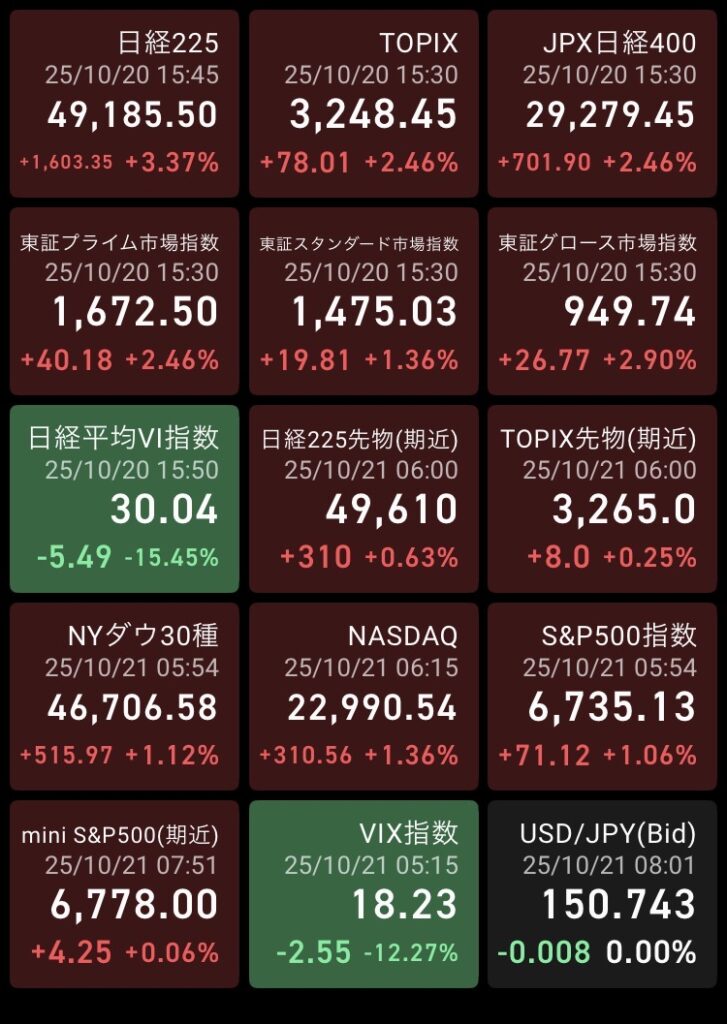 米中摩擦懸念の緩和、アップル株の上昇、そして高市首相就任への期待感が重なり、心理的節目である「日経平均5万円」接近も現実味を帯びてきた。