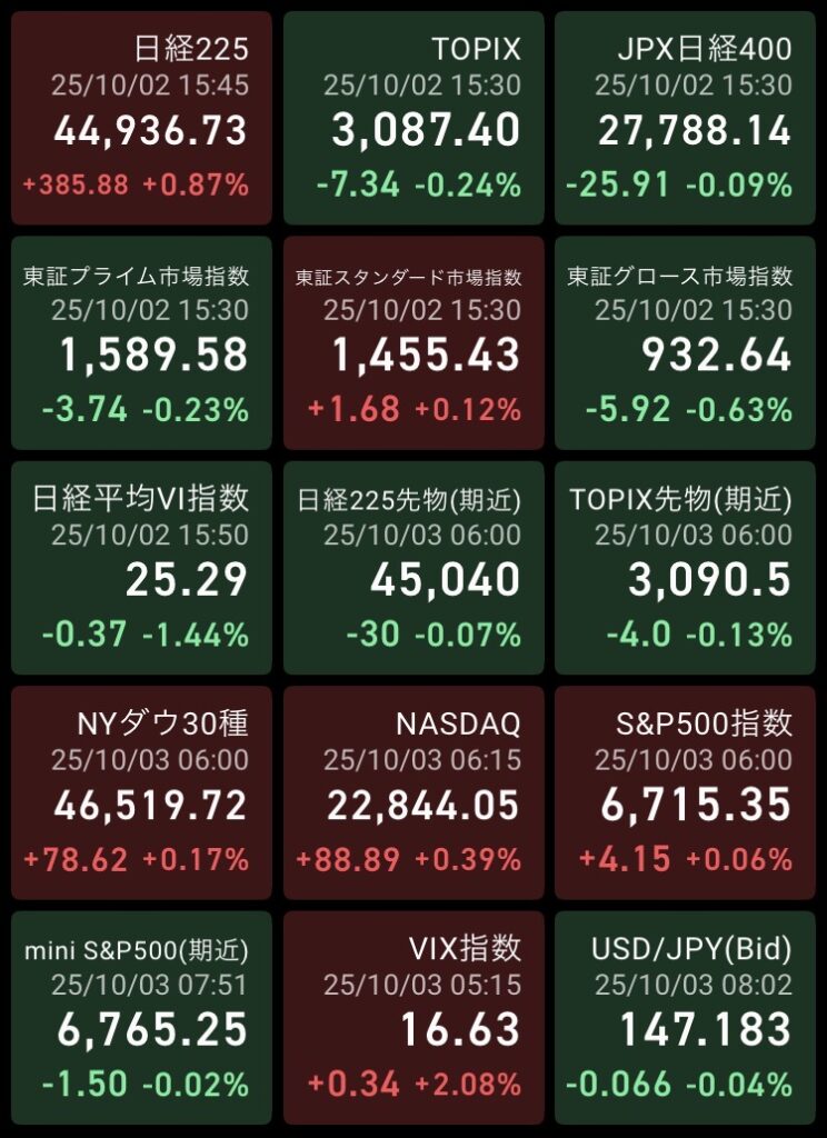 10月2日の日経平均は44,936円で取引を終え、前日比+385円と5日ぶりに反発した。寄り付き直後には半導体株を中心に買いが広がり、一時は45,100円台をつける場面もあったが、その後は調整を経て再び45,000円を試す展開となった。ただし、引け値では45,000円を回復できずに終了した。TOPIXは逆に小幅安で終え、相場全体としては上げの広がりに欠けた。