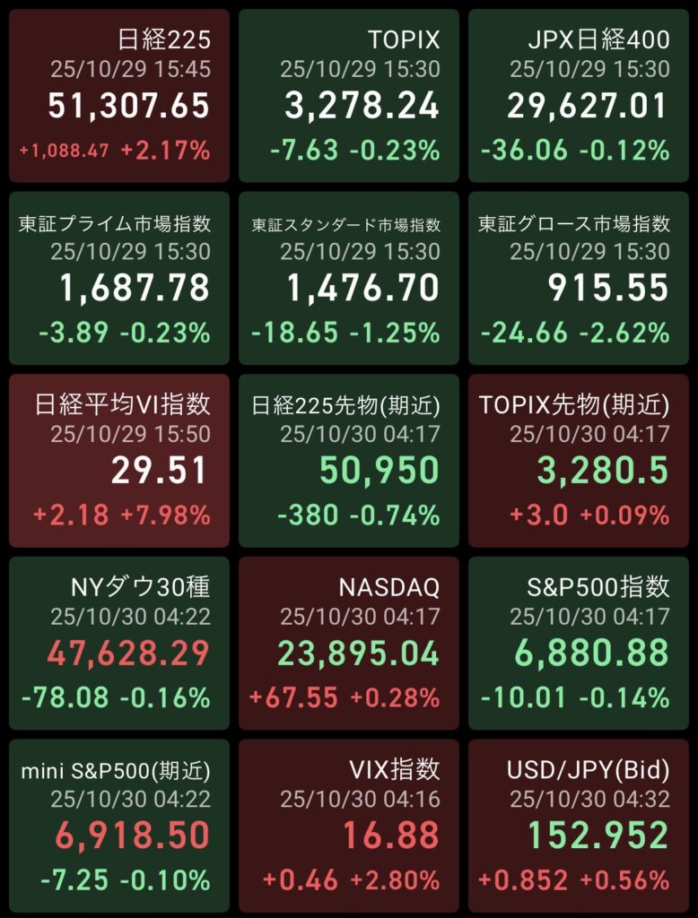 29日の日経平均は 51,307円(+1,088円/+2.17%) と大幅反発した。