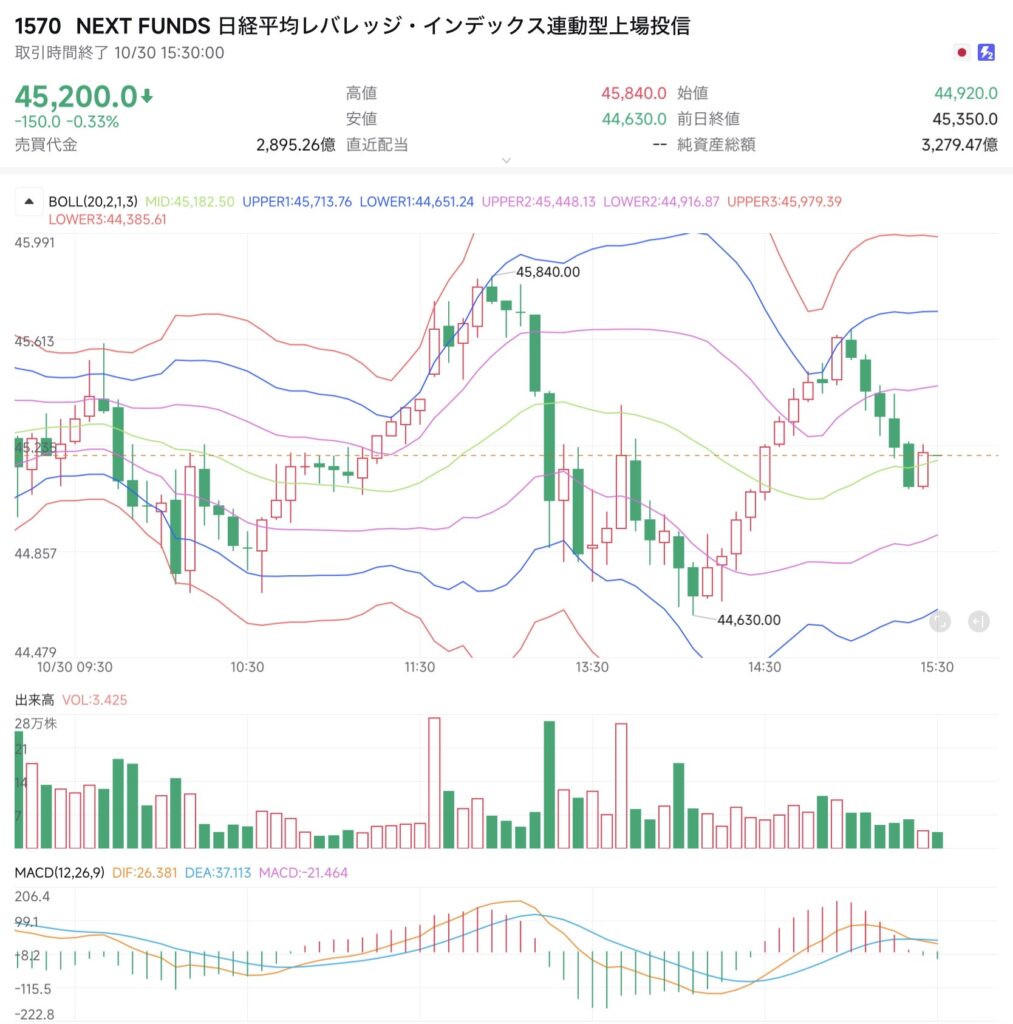 - NF日経レバ(1570):始値44,920円/高値45,840円/安値44,630円/終値45,200円(-150円)