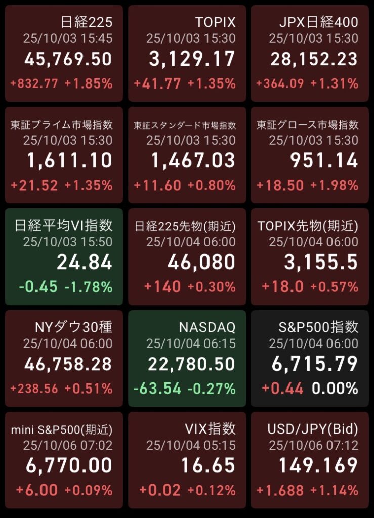 海外市場では、NYダウとS&P500が史上最高値を更新。FRBの追加利下げ観測が強まり、金融環境は緩和的に傾いている。一方で、NASDAQはハイテク株の調整で小幅安(-0.27%)。VIX指数は16.65と安定しており、市場全体に過度な警戒感はない。為替はドル円149円台に上昇し、円安が再び進行している点も日本株には追い風である。