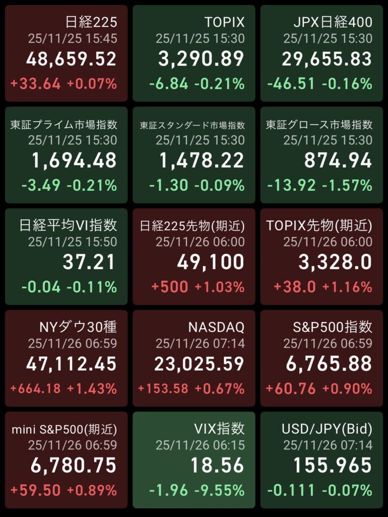 前日の東京市場は、米国株の底堅さを背景に大幅ギャップアップで始まったものの、急速に上値が重くなる展開であった。日経平均は朝方に高値をつけた後失速し、48,659円(+33円)で引けた。上昇は小幅にとどまり、実質的には寄り天井の弱い値動きとなった。