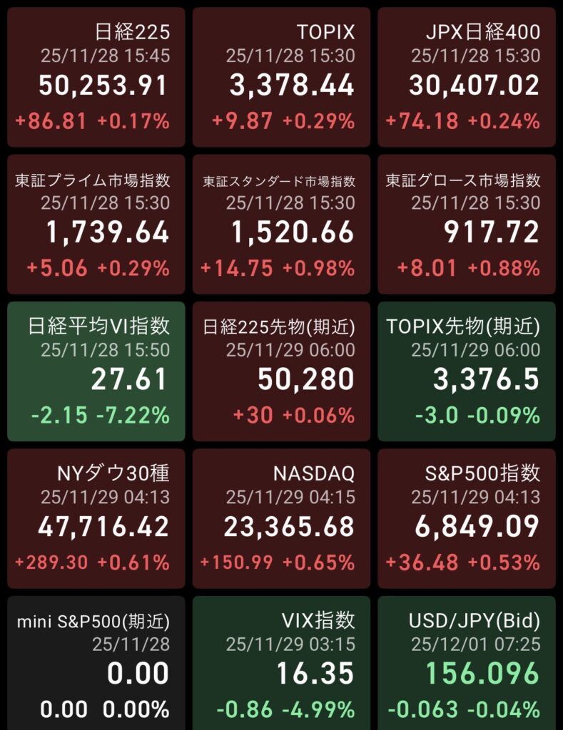 米国は感謝祭翌日の短縮取引で NYダウ +289、NASDAQ +150、S&P500 +36 と小幅ながら続伸。VIXは 16.35(−4.99%) と低下しており、過度なリスク回避姿勢は後退している。