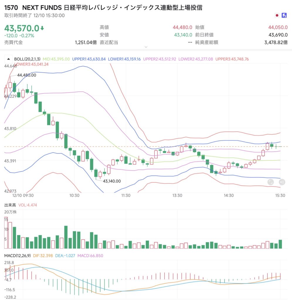 本日はロイター予測レンジと前日の乖離値、値幅を基準にNF日経レバの想定レンジを43,300〜44,200円と設定し、押し目買いからの短期回転を基本戦略としていた。FOMC前で方向感が出づらい状況を踏まえつつ、下落時の反発と44,000円台前半の抵抗を意識したトレードプランであった。