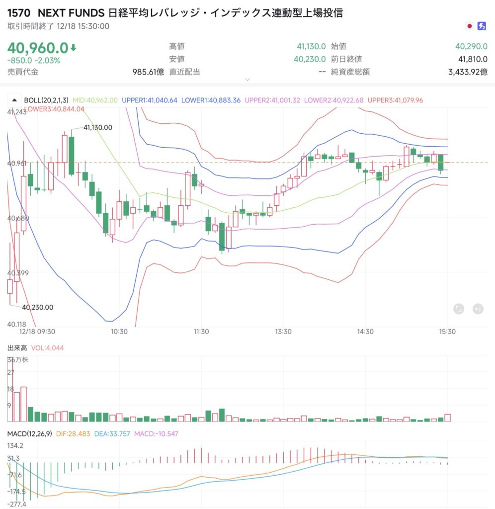 NF日経レバは寄り付きから40,290円と弱く始まり、前場早々に40,230円まで下落。想定下限に近い水準まで売られた後は切り返し、場中には41,130円まで戻す場面もあったが、引けにかけては再び伸び悩み、40,960円で終了した。
