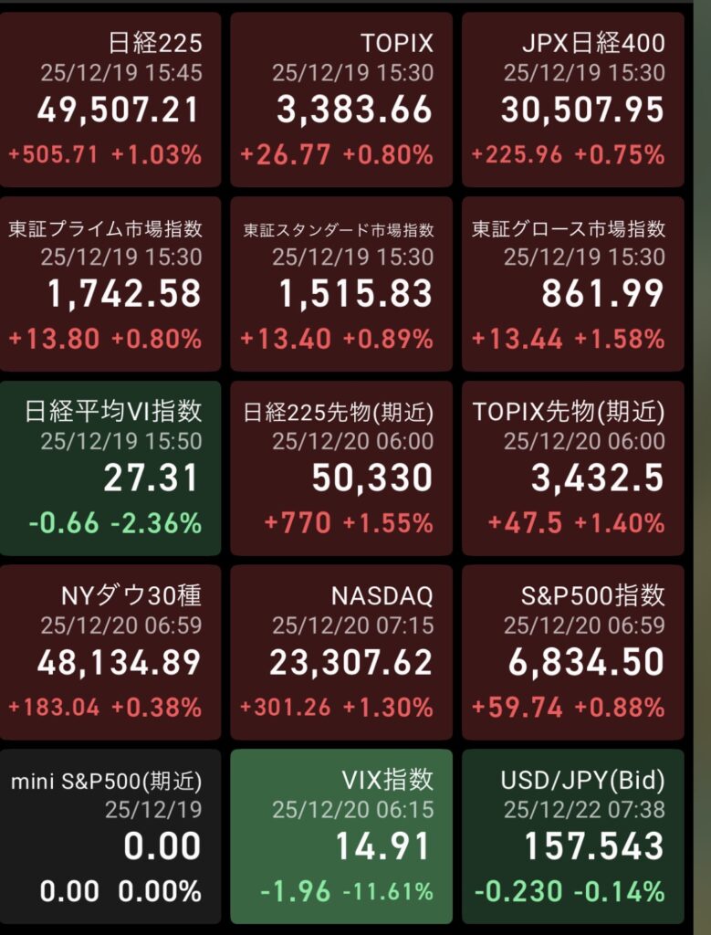 前週末12月19日は、米国株高と円安進行を追い風に日経平均が49,507円まで上昇し、500円超の反発となった。NF日経レバ(1570)も41,720円で引け、想定していた自律反発シナリオは概ね機能した一日だである。