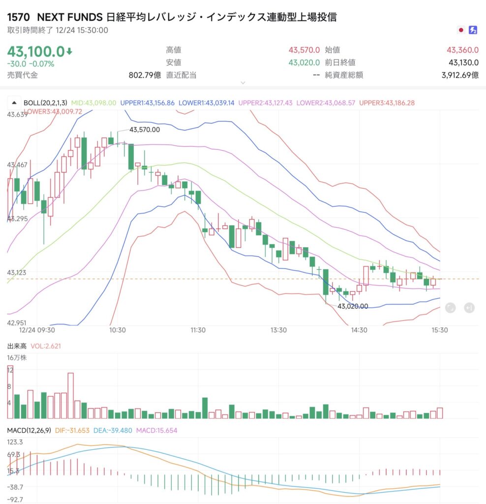 12月24日は、日経225の想定レンジを50,200〜50,800円、それに連動するNF日経レバ(1570)を42,900〜43,600円と設定し、年末特有の薄商いを前提としたレンジ内往復戦略で臨んだ。