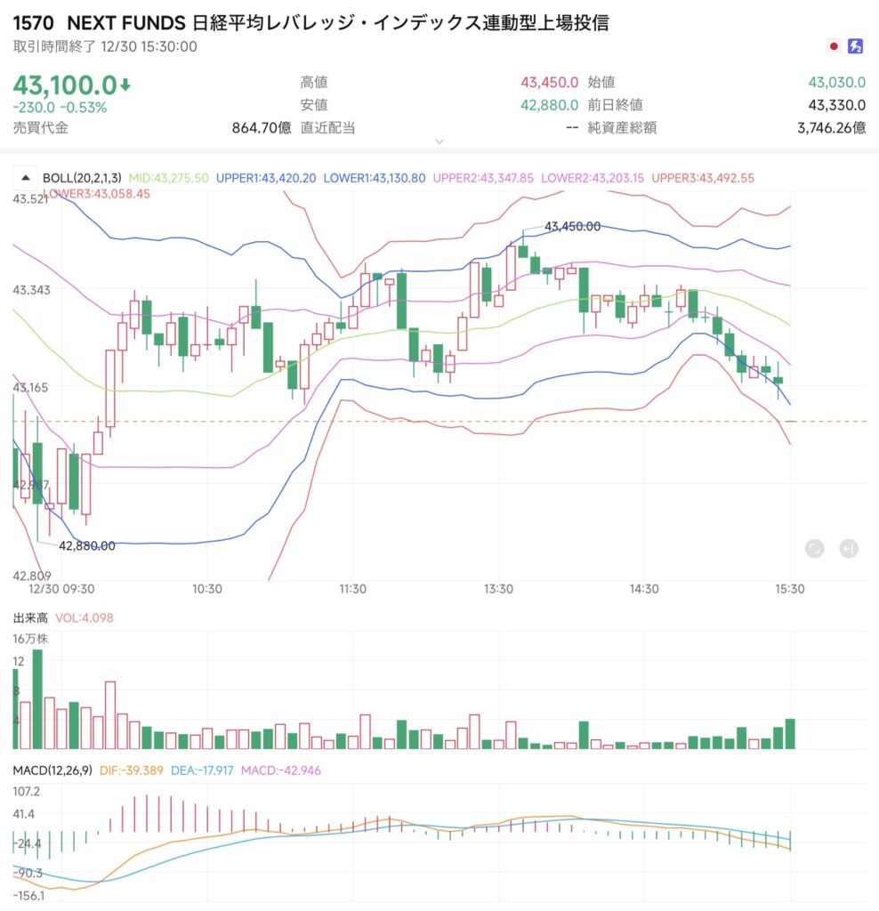NF日経レバも42,880円まで下落後に持ち直し、高値は43,450円まで到達。想定レンジ内での推移に収まり、年末らしい方向感の乏しい値動きであった。