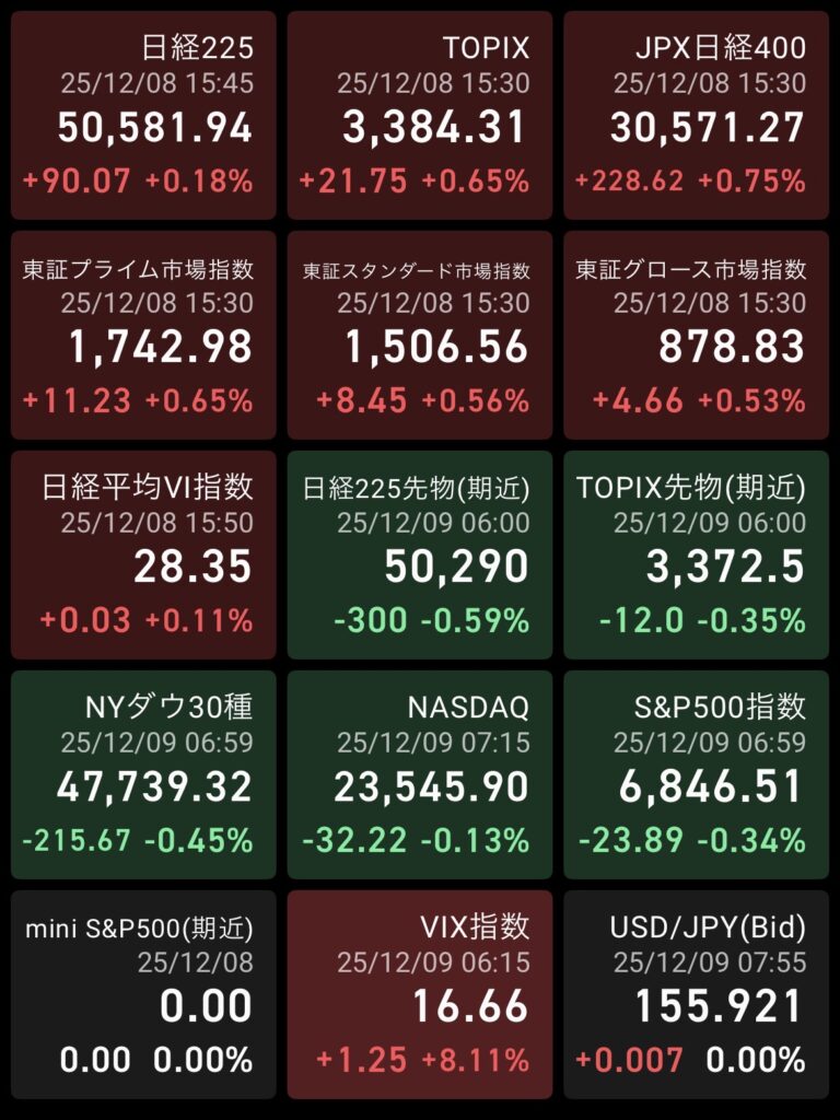 前日の12月8日の日経平均は50,581円(+90円)で引けた。寄り付きは米株高を受けて堅調だったが、その後は失速し、一時は50,234円まで下落するなど方向感に欠ける展開であった。ただし下値では買いが入り、後場は前日終値を挟んでもみ合いながらも引けにかけて強含んだ。