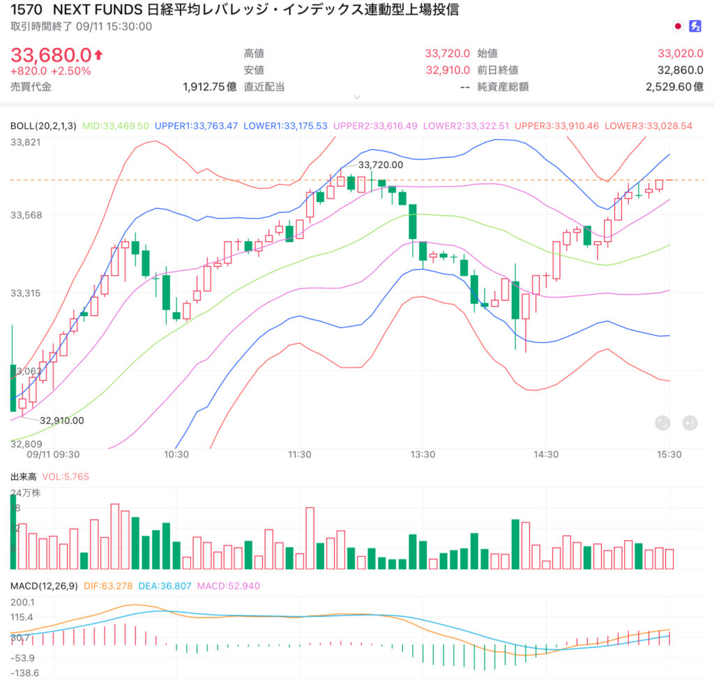 - NF日経レバ(1570):始値33,020円/高値33,720円/安値32,910円/終値33,680円(+820円)