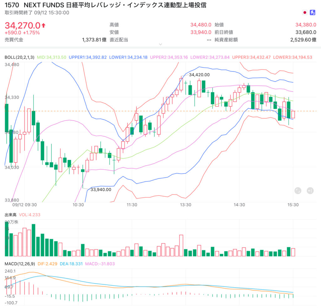 本日は米株高とCPI通過による安心感から続伸を想定し、NF日経レバ(1570)のレンジを33,800円〜34,400円と設定。乖離値10,900円を基準に押し目買いを狙い、34,300円超では利確を意識する戦略とした。テクニカル的にもMACDがシグナルを上抜けし、移動平均線は強気トレンドを維持。RSIは70を意識しながらも上昇余地が残る局面であった。