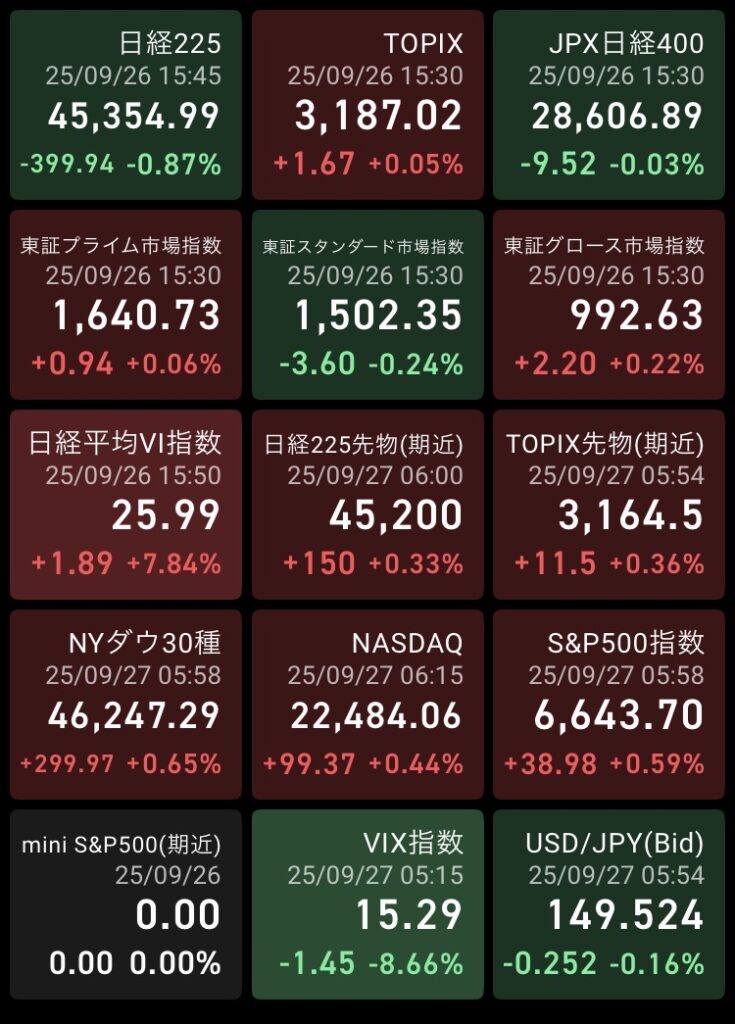 先週末26日の日経平均は45,354円(-399)と大幅反落した。