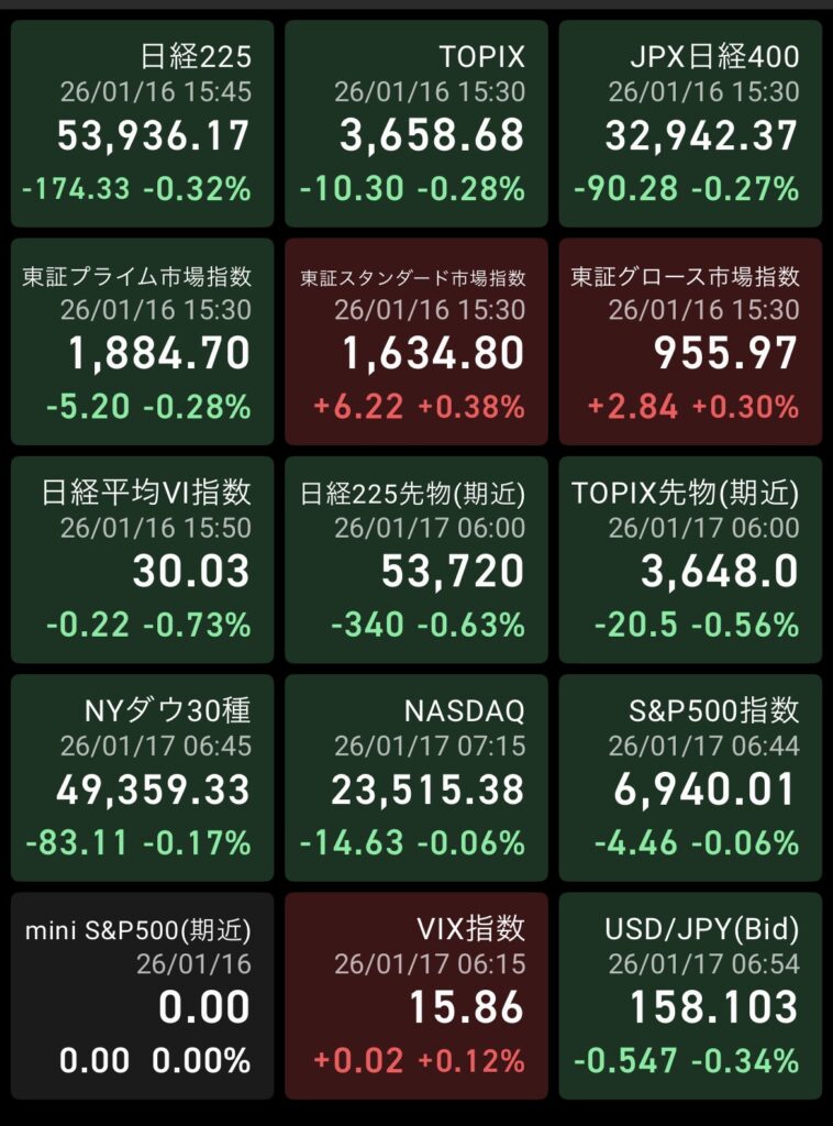 米国株式市場はキング牧師生誕日の祝日を控え、先週末はほぼ横ばいで終了した。ダウ、NASDAQ、S&P500はいずれも小幅安にとどまり、リスクオフ一色という状況ではない。一方でVIX指数は15台後半と低位を維持しており、急激なリスク回避ムードは限定的とみられる。