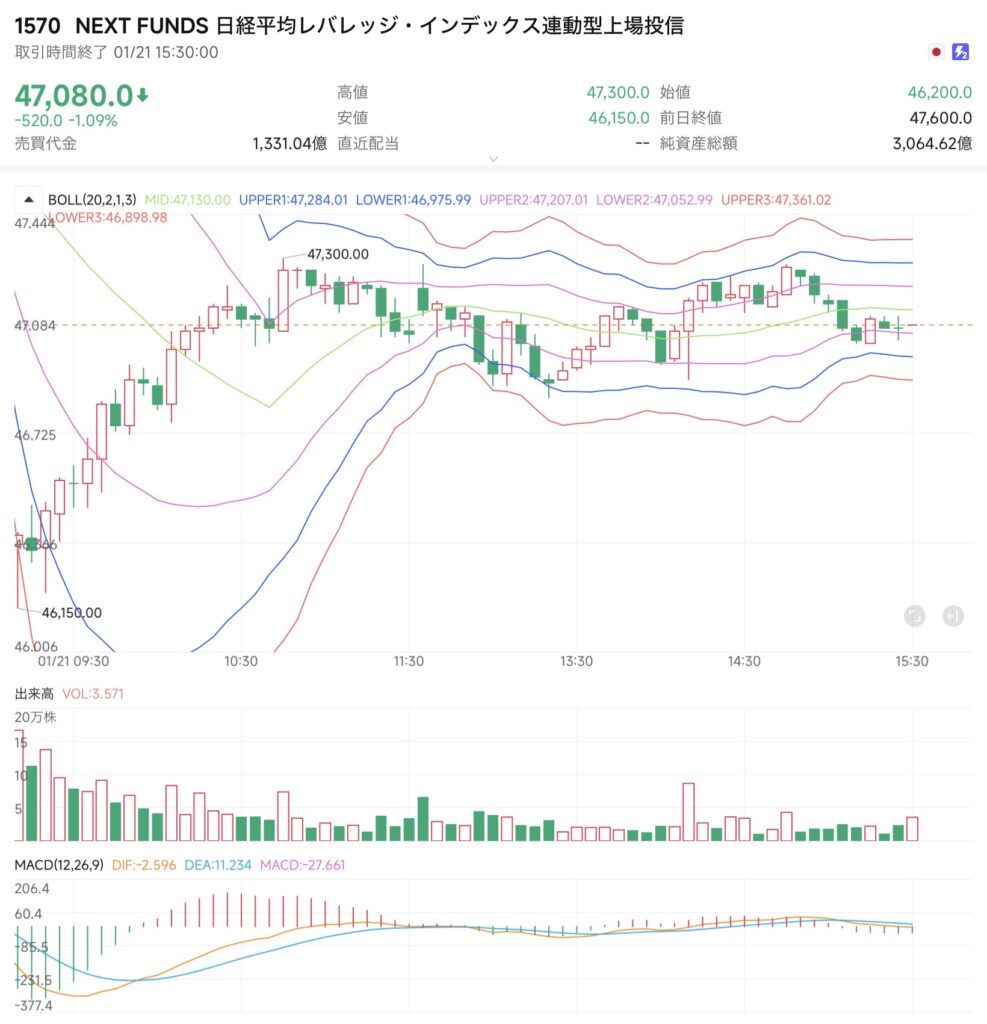 ロイター予測の日経平均レンジは51,900円〜52,500円。これを前提に、NF日経レバ(1570)の想定レンジを46,500円〜47,800円、想定値幅を1,000円と設定し、寄り付き直後は様子見、下げ止まり確認後の短期回転を基本戦略とした。