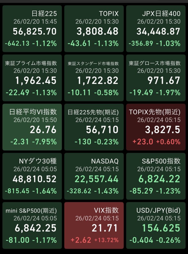 NYダウは48,810ドル(-1.64%)、NASDAQは-1.43%、S&P500は-1.23%と主要3指数が1%以上下落した。さらにVIX指数は21.71まで上昇しており、市場心理は不安定である。