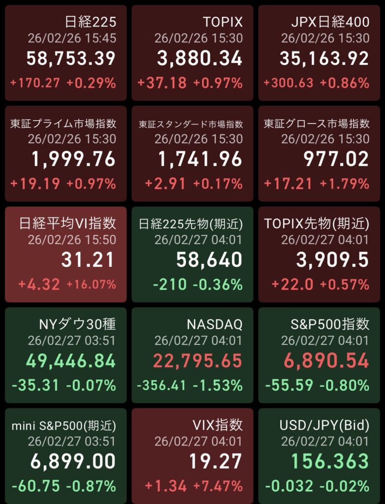 2月26日の東京市場は、指数こそ3日続伸となったが、内容は明確な「寄り天失速型」であった。日経平均は始値58,955円から開始5分で59,332円まで急伸。しかしその後は売りに押され、終値は58,753円と上げ幅を大きく縮小した。