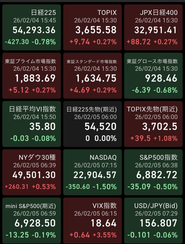 一方で、画像から確認できる昨夜の米国市場では、NYダウは上昇したものの、NASDAQとS&P500は下落。VIX指数は18台半ばまで上昇しており、ハイテク・AI関連には引き続き警戒が必要な状況である。