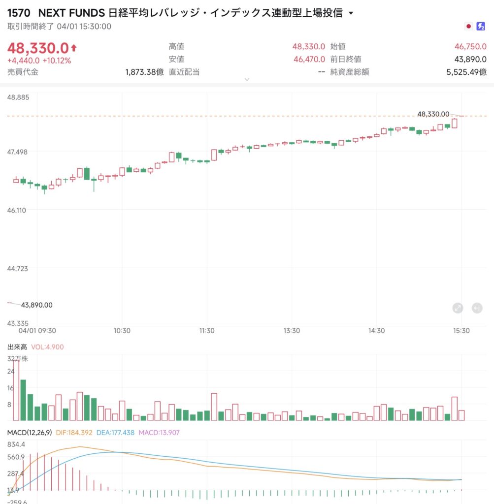寄り付きから想定レンジの上限(47,500円)に近い46,750円でスタートした1570は、一時の押し目(46,470円)を作った後、引けにかけてほぼ一本調子で上昇を続けた。終わってみれば高値引けの48,330円と、ショート勢を完全に焼き尽くす圧倒的な強さを見せつけた。