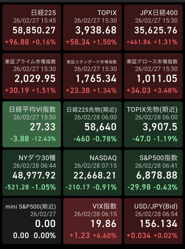 2月27日の日経平均は4日続伸、終値58,850円と史上最高値を更新した。